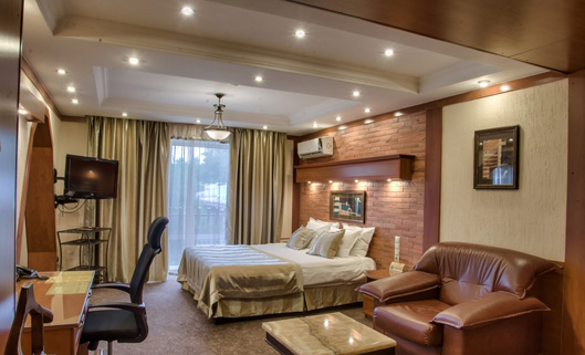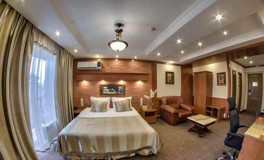 Этот тип номеров имеет разную вместимость: здесь могут с комфортом разместиться 1-2 человека, включая детей. Все наши полулюксы оформлены в сдержанном и лаконичном европейском стиле: здесь можно не только отдыхать, но и плодотворно работать, если в этом есть необходимость.